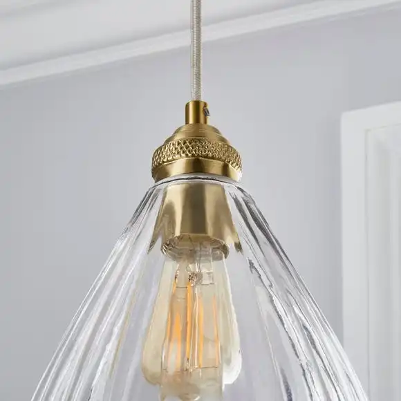 Introduce a feminine touch to your home with this stunning Churchgate Allexton Glass Ceiling Fitting. Featuring a striking brass base paired with a gorgeous clear flutted ribbed glass shade. This ceiling fitting is complete with a height adjustable grey rope suspension, so it can be adjusted to your desired length. Pair this ceiling fitting with matching family pieces from the Churchgate Allexton range for a coordinated look.