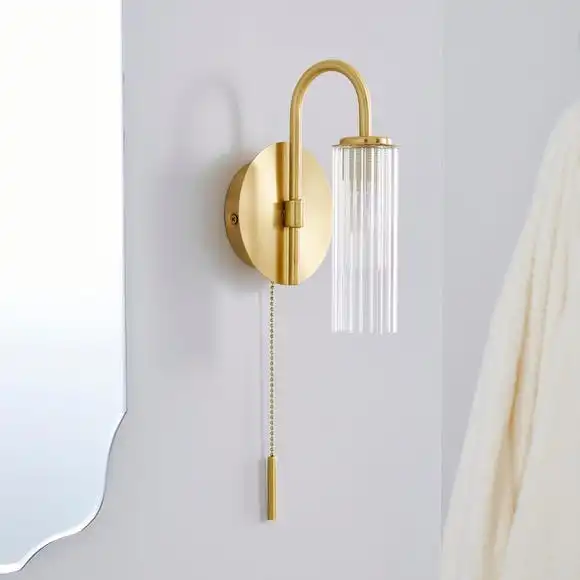 This stylish wall light has a modern gold colourway that will complement an array of home decors beautifully. Supplied with a pull cord switch, this piece is suitable for any indoor room, including bathrooms. Matching family items are also available.