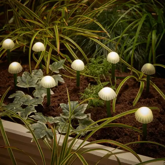 Create an enchanting glow in your outdoor space with these 10 light solar mushroom string lights. Perfect placed underneath trees or shrubs, these mini mushrooms are great for any outdoor garden space. Each LED mushroom illuminates with a soft warm white glow and are powered by a solar panel. Place these mushroom string lights together at varying heights into soft soil to create a truly magical night time display.