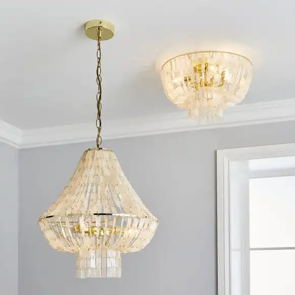 Boasting a natural capiz shell with a gold a gold finish frame, our Abanna Ceiling Fitting brings elegance and sophistication within the chosen room. Great for hallways, the ceiling fitting sits 25cm down from the ceiling. 3 x SES/E14 Candle bulbs are required to be purchased in conjunction with the Abanna Ceiling Light. Fully dimmable compatible with a suitable bulb and light switch. Matching family items are available in the Abanna range.