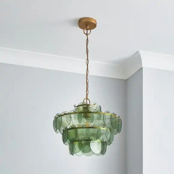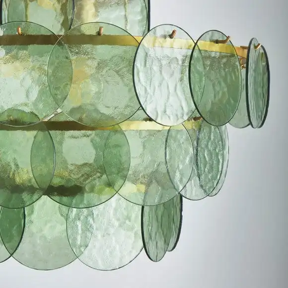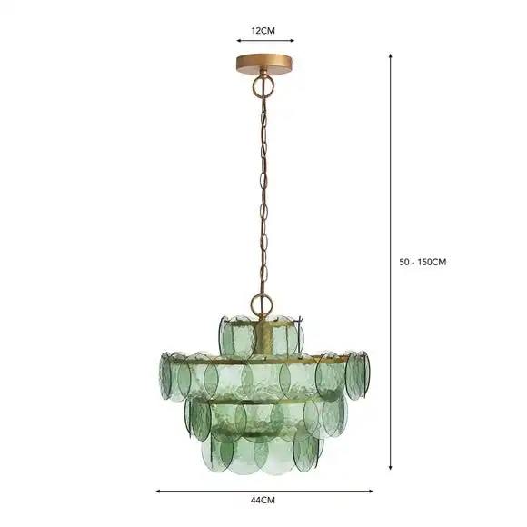 Presenting elegance and beauty, the Alohi 4-tiered chandelier gracefully falls with a gold metal frame and option of rich golden amber hues or refreshing, uplifting green colours. Displayed within the large 44cm diameter, are painted glass discs, arranged in a circular shape and slightly overlapping to create a range of deeper and softer tones. Ideal for any part of the house, this chandelier will look especially complimenting in a living or dining room to bring attraction and charm to the room.