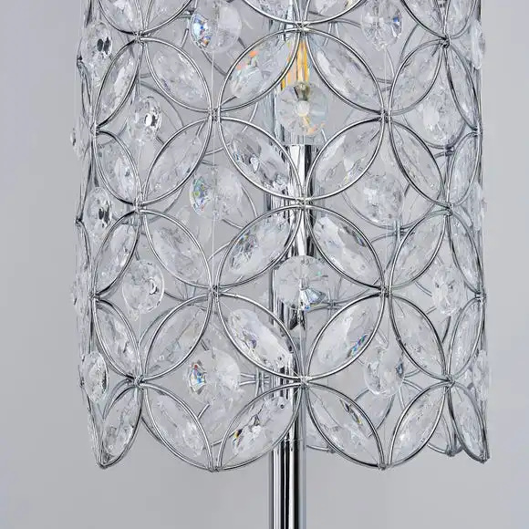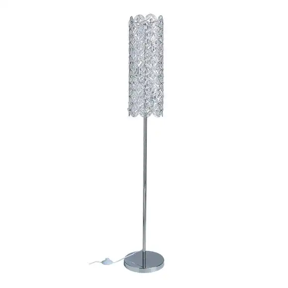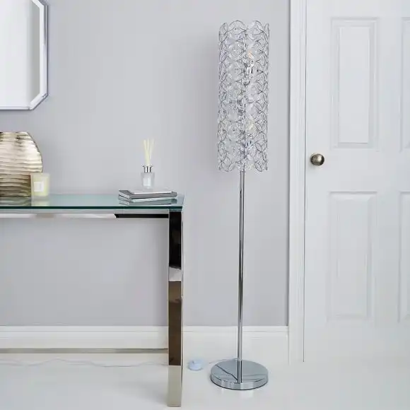 This beautifully created floor lamp is the perfect way to add an eye-catching feature to your room. It features a decorative jeweled detail, hand wired clear acrylic beads and a chrome metal frame work.