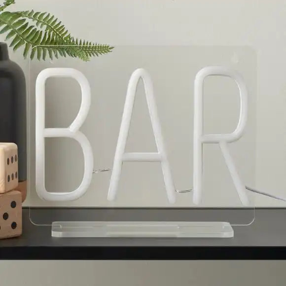 Featuring the Bar Neon Sign Light, powered by a USB cable and mains adapter. The LED tubing is touchable even when on, this sign does not get hot making it safe to use in any room of your home. Simply plug into a computer USB port to power the sign, or use the supplied adaptor to plug into a standard mains socket. This contemporary neon sign is perfect to enliven a living room, bedroom, retro fit kitchen, or a stylish addition within the bar or iconic games room. The perfect piece to add personality to any wall in your home.