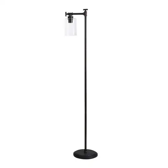 The Bates 1 Light Industrial Floor Lamp is perfect for adding a contemporary industrial feel to your room. Beautifully designed with a distressed black metal industrial style frame with decorative wheel details, paired with a clear cylindrical glass shade. This floor lamp is dimmable compatible with a suitable bulb and dimmer switch. Pair this piece with matching family items from the Bates range.