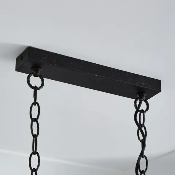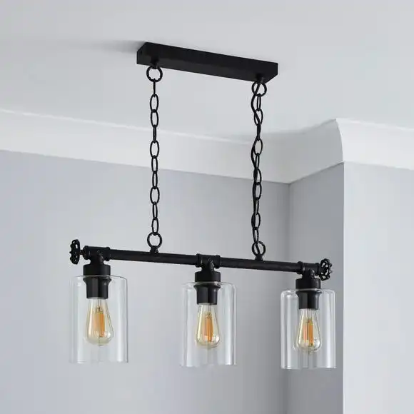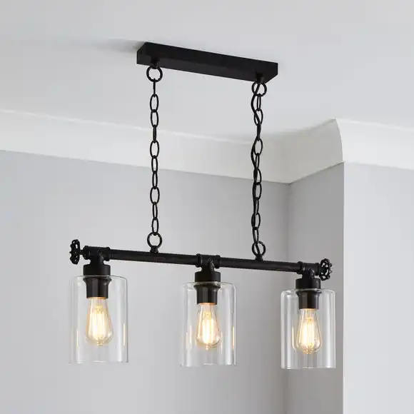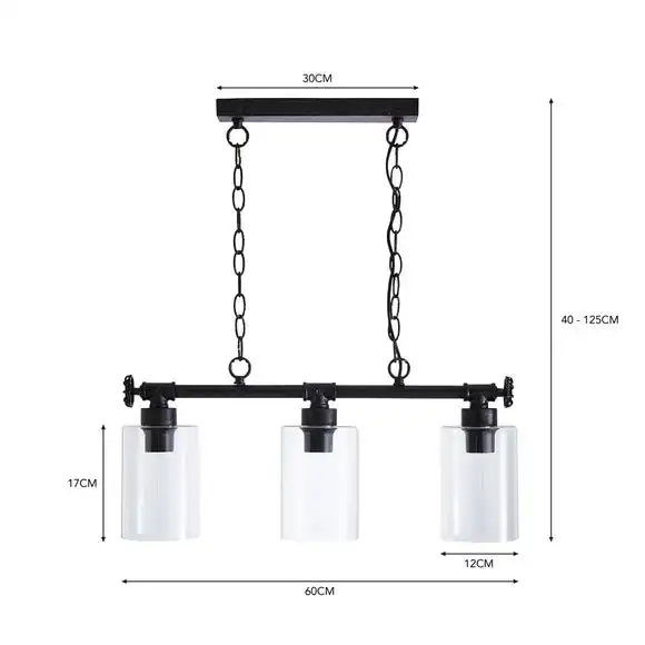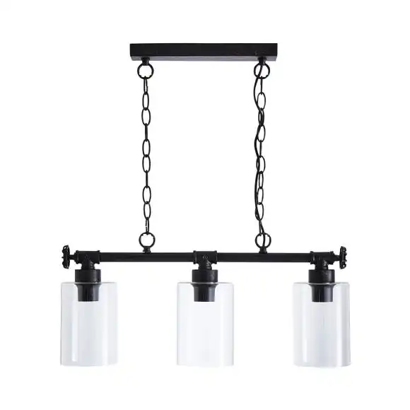 Perfect for adding a contemporary industrial look to your home. The Bates 3 Light Industrial Ceiling Fitting features a stylish distressed black metal frame with decorative wheel details, paired with 3 clear cylindrical glass shades and a height adjustable chain set. This ceiling fitting is dimmable compatible with a suitable bulb and dimmer switch. Matching items are also available from the Bates range to help coordinate your home.