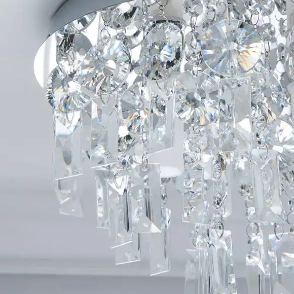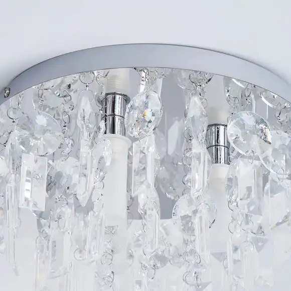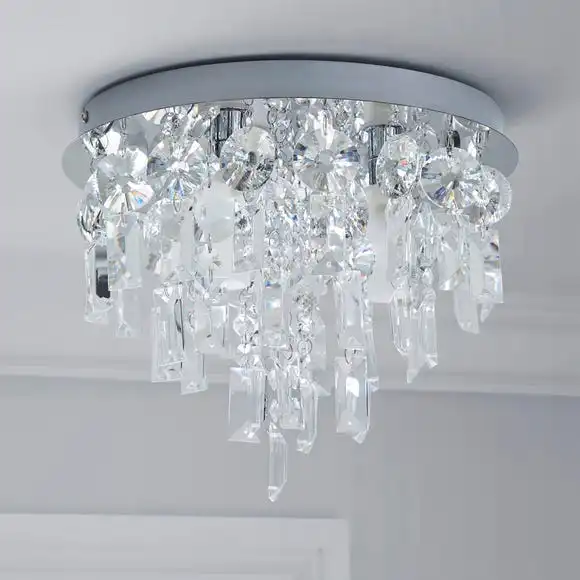 Elegantly designed, this three light dimmable ceiling fitting features beautiful strands of faceted beads cascade around the light and chrome finished base. Suitable to use in the bathroom.