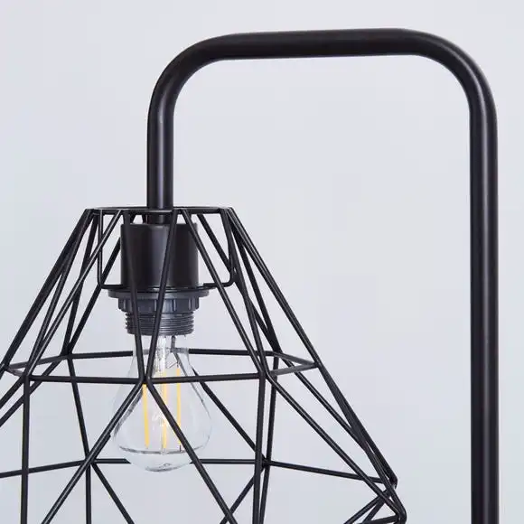 Add a contemporary element to your home décor with this stunning floor lamp, featuring a geometric frame head with an inline floor switch, cable length 100cm, and completed with a smooth black finish.