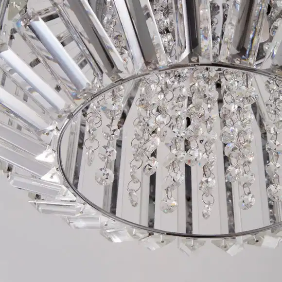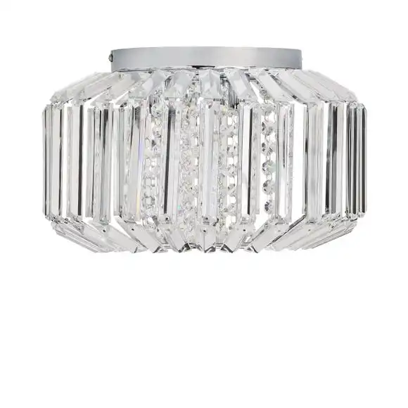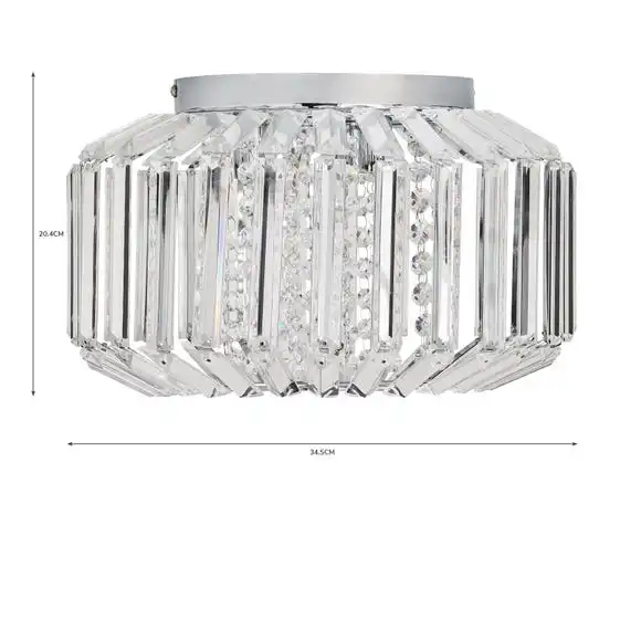 Deisgned with stunning crystal glass and hanging glass bead details, the Chantilly Flush fitting would bring a touch of class and style to any space. This elegant light fitting comes complete with complementing chrome plated details adding to the luxe styling, and is fully compatible with dimmer switches.