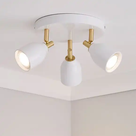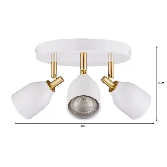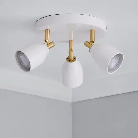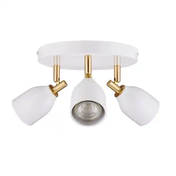 Stylishly crafted, this LED spotlight features three lights with adjustable and dimmable heads, offers a modern on-trend, white gloss finish with golden satin brushed effect.
