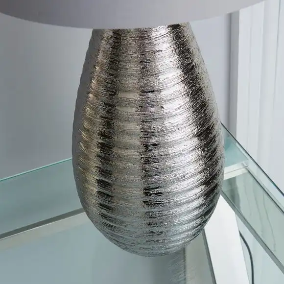 Add some style to your interior with this chrome designed ceramic table lamp. It features a lovely, textured chrome base with a brushed cotton mix shade in a light grey colourway.