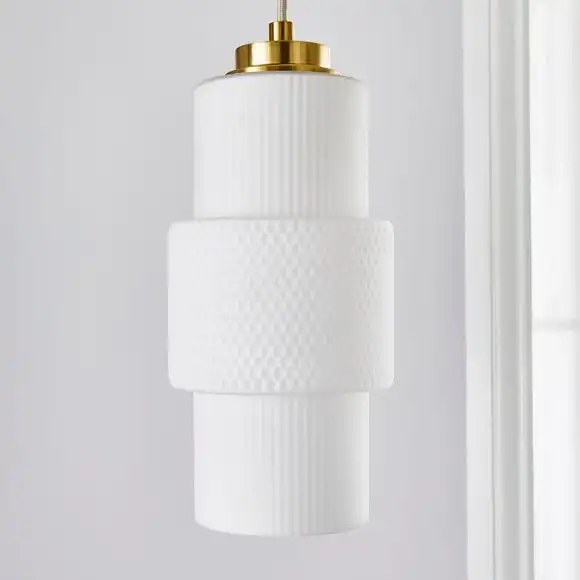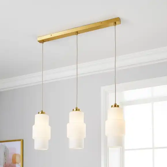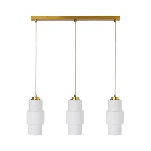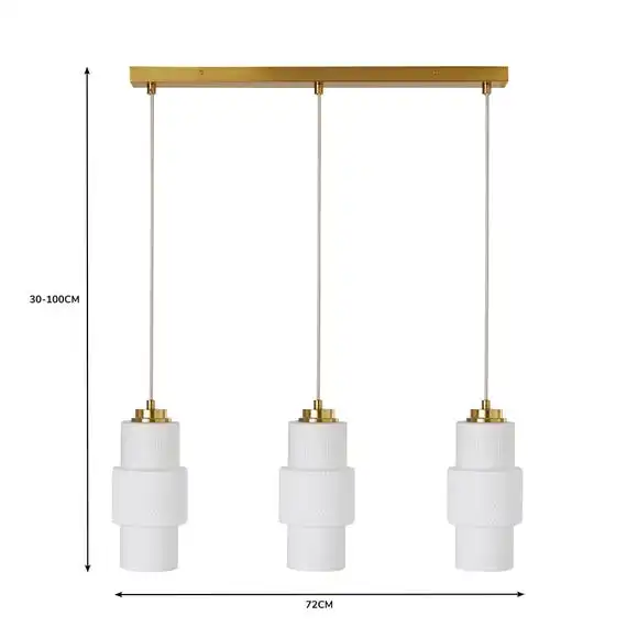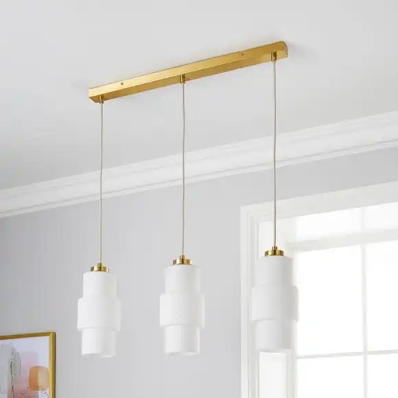 Boasting a modern take on retro style, the Elena 3 Light Diner Ceiling Fitting is beautifully crafted from frosted glass shades with a textured and ribbed finish, complete with contrasting satin brushed gold effect details and a bar ceiling base, paired with height adjustable fabric cables. This stunning diner ceiling fitting is perfect for adding a feminine touch to your kitchen diner space and matching family items are available to help coordinate your home.