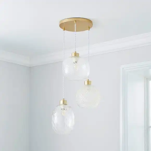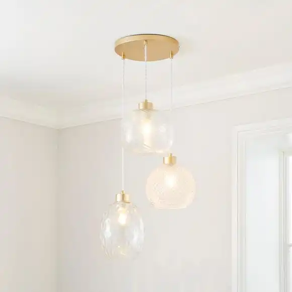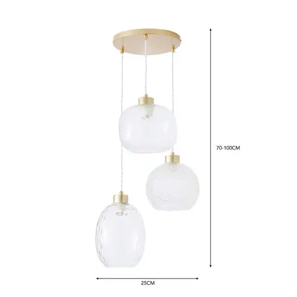 Add a luxe look to your home with our Elodie 3 Light Cluster Ceiling Fitting, designed with three differently patterned and shaped glass shades. Each shade can be adjusted to height so you can cater it to yourself. Complete in a gold painted finish for that extra stunning look, this light is compatible with a dimmer switch so you can set the perfect ambience.