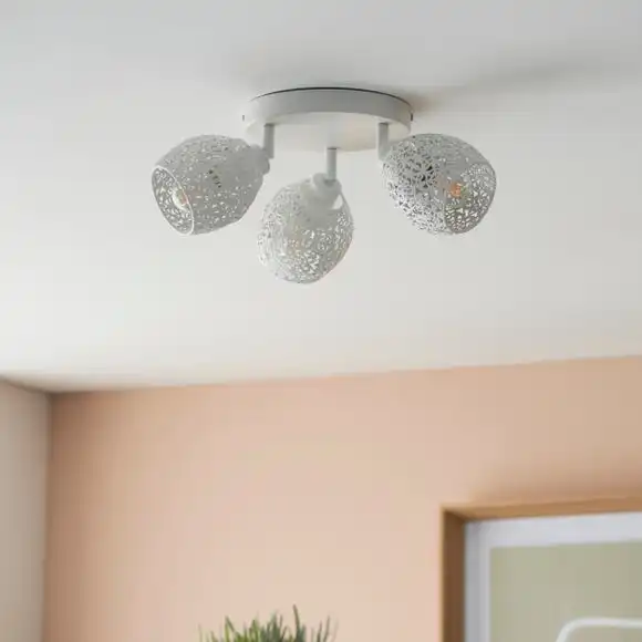 Add a feminine touch to your home with this gorgeous Fearne 3 Light Spotlight, beautifully designed with a matt white paint metal base and 3 spotlights with dainty patterned detail shades. This spotlight will look beautiful in any room and you can even coordinate your home with matching family items. Dimmable compatible with a suitable light switch and bulb.