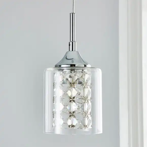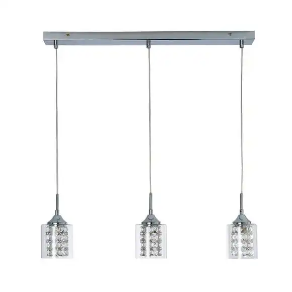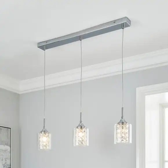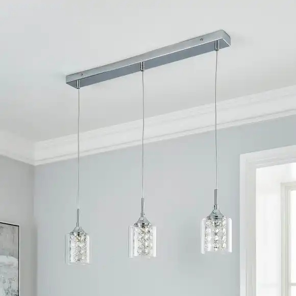 Introduce a luxurious look to your home décor with the Frankie 3 Light Bar Ceiling Fitting, beautifully designed with a chrome bar base and three crystal shades enclosed within clear glass shades. This contemporary style light features 3 height adjustable clear flex cables, allowing you to collapse or extend the shades to create a unique look to better suit your space. Matching family items available to help coordinate your home.
