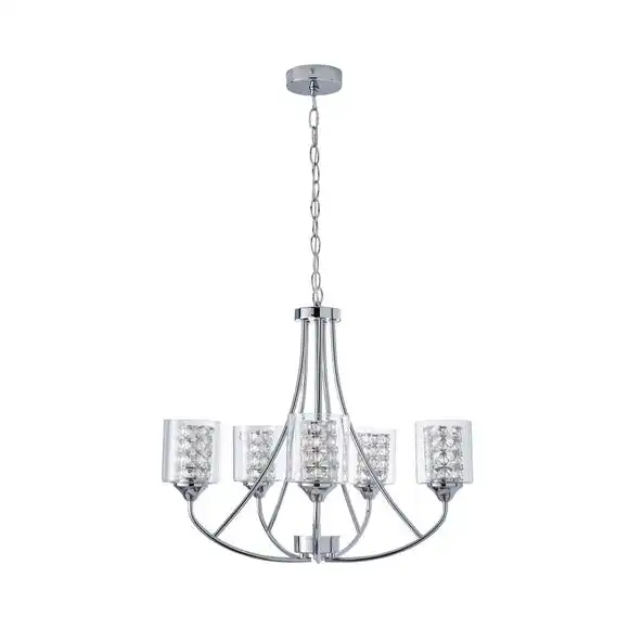 For a glamorous focal point in a room, add this beautiful Frankie Ceiling Fitting to your home. Beautifully designed with a plated chrome frame and five clear glass shades with crystals enclosed within. Complete with a height adjustable clear flex chain set, so you can choose your desired length to suit your space. This ceiling fitting has matching family items available to help coordinate your home. Dimmable compatible with suitable bulbs and light switch. A 2-year guarantee is provided with this ceiling light.