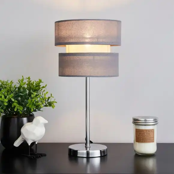 Stylishly made with a chrome based finish, this table lamp features a grey cotton shade with a cut-out design and a textured finish. With a collapsible style and little assembly, you’ll have the light shade of your dreams in no time.