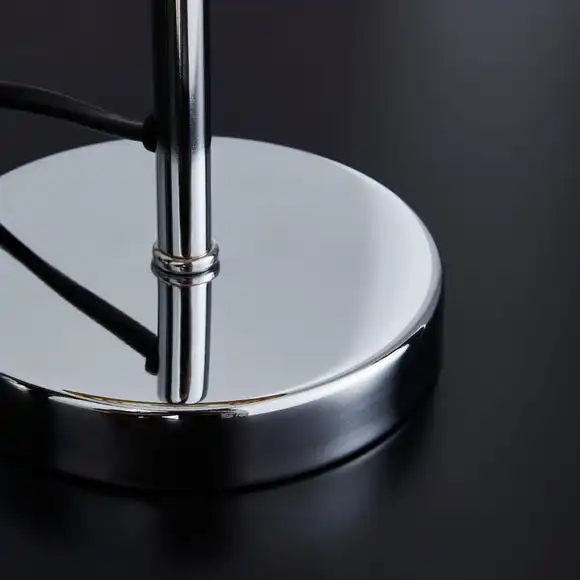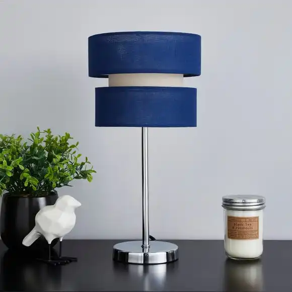 Designed with a soft cotton fabric shade with a cut out structure in a navy blue hue, this Frea table lamp is complete with a slender chrome stem and circular base. With a collapsible style and little assembly, you’ll have the light shade of your dreams in no time