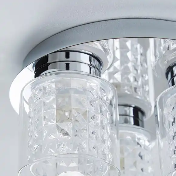Add a touch of style to your bathroom with this chrome finished ceiling light. Made with durable materials, this flush light features three decorative glass shades and dimmable option.
