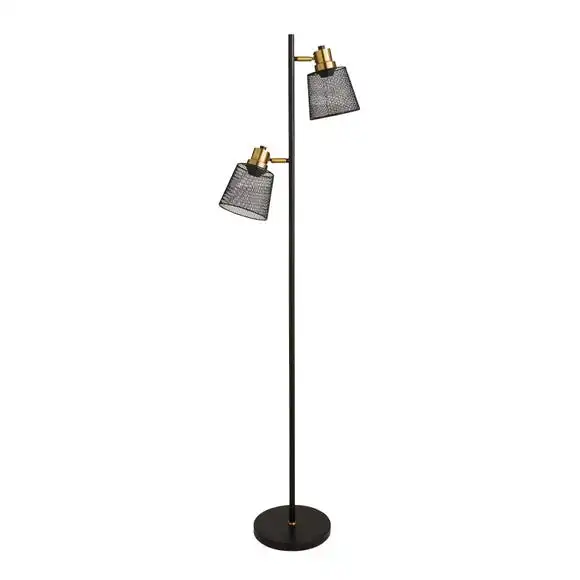 Offering a gorgeous modern style, the Idris floor lamp is finished in a contemporary matt black finish with contrasting antique brass features for an industrial look. Perfect for any living space, this fitting features two adjustable fixtures at varying heights with metal mesh shades.
