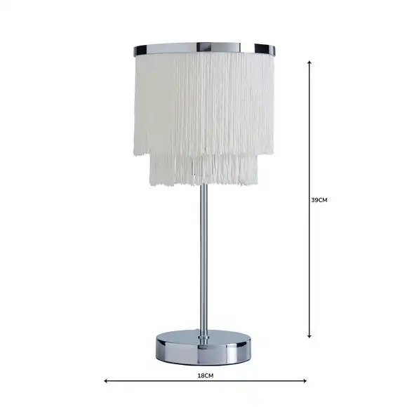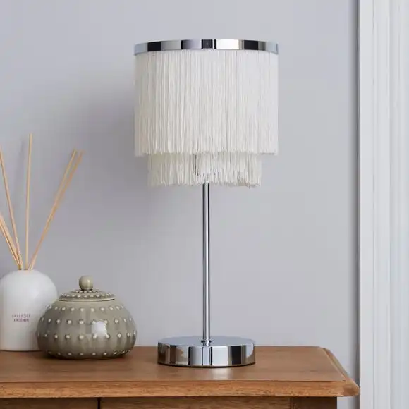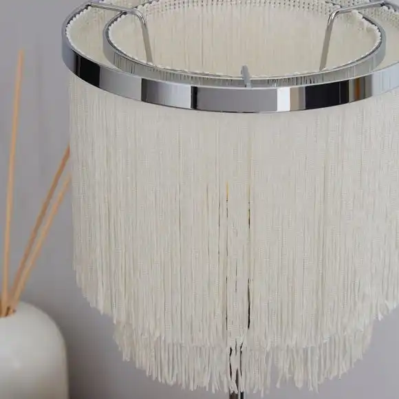 Add a glam touch to your home with this stunning chrome table lamp. Designed with a two tiered tassel shade, the Jaz table lamp would be a beautiful addition to any room.