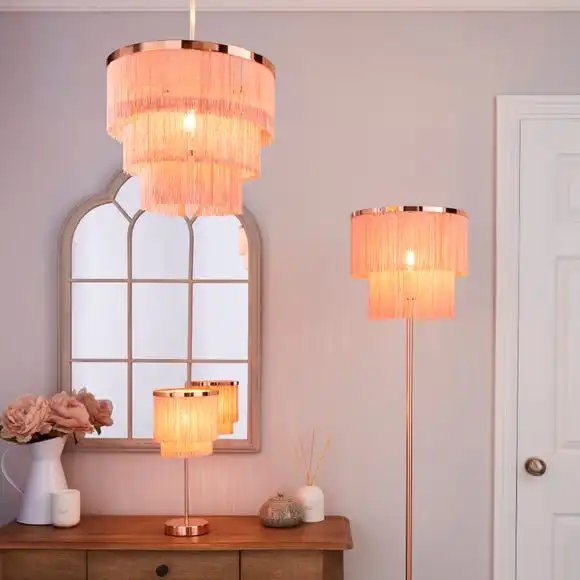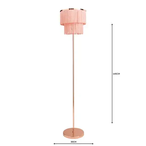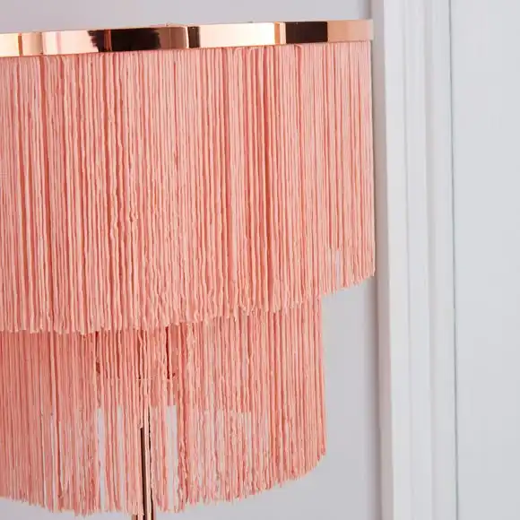 This Jaz floor lamp features a two tier tassel fringe shade with an inline floor switch, a cable length of 100cm and completed with a smooth chrome finish.