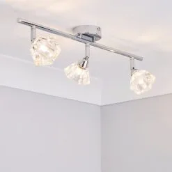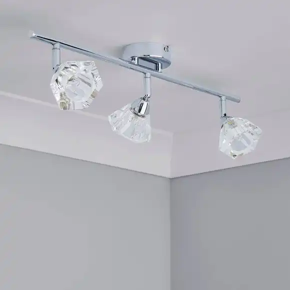 Designed with cut glass shades in the shape of diamonds this spotlight features 3 lights that have adjustable heads that can be used with low energy bulbs for efficiency while the frame is completed with a chrome finish.