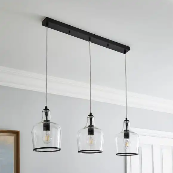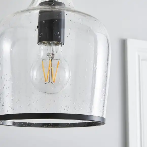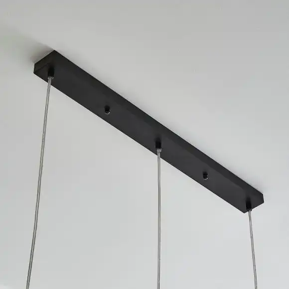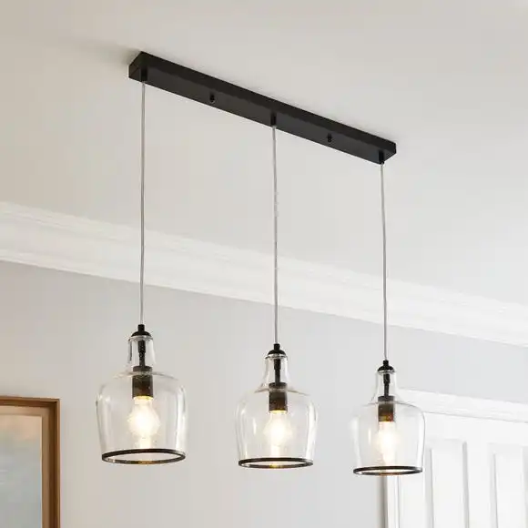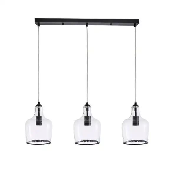 The Lenny Pendant 3 light fitting has been beautifully crafted with clear bubbled glass, a modern black trim and a matching black ceiling bar for a timeless contemporary appearance. This light fitting is height adjustable with three fabric cables, so you can choose your desired length to suit your space. The Lenny is the perfect piece for adding a timeless look to your home with a modern twist. This piece is dimmable compatible, making it both an attractive and practical product. Available in other colourways and matching family items to help coordinate your home.