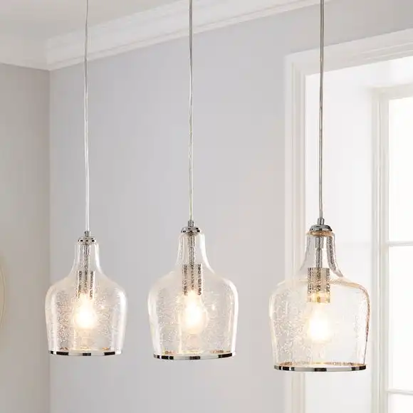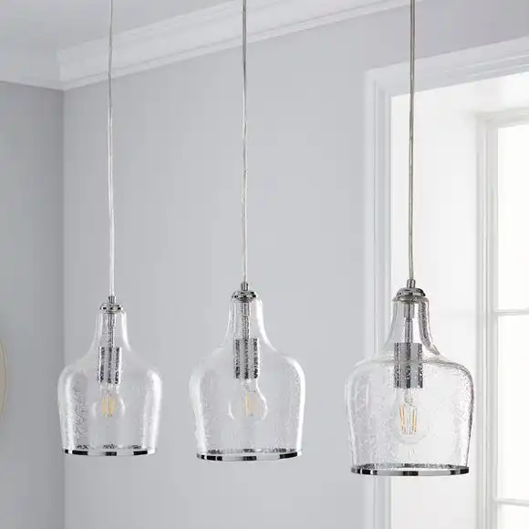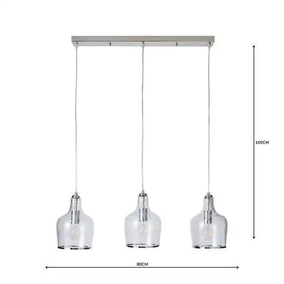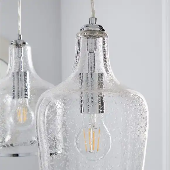 The Lenny Pendant 3 light fitting has been crafted with bubbled glass, elegant chrome trim and a matching chrome fitting for the vintage yet contemporary appearance. This light can also be adjusted at the flex. A perfect piece for adding a classic look to your home with a modern twist. This piece is dimmable compatible, making it both an attractive and practical product.