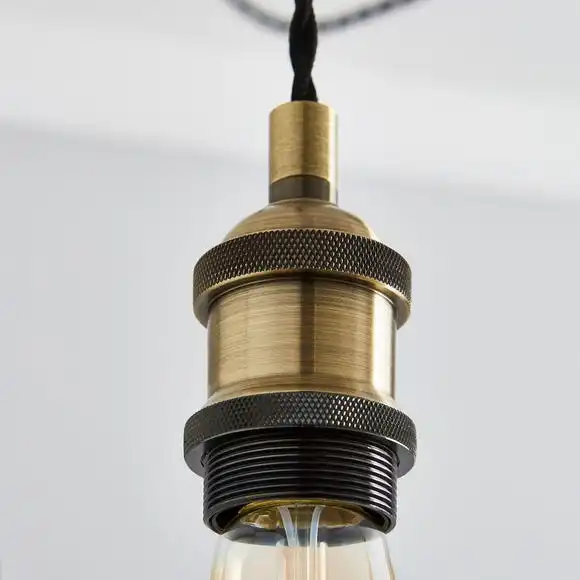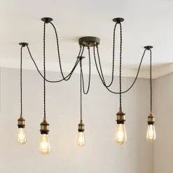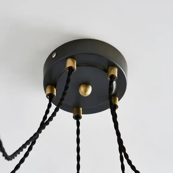 This industrial inspired logan spider fitting features a dark nickel painted finish and black fabric flex cables with an antique, brass detailing. Bulb holders and chords can be positioned easily by using the ceiling hooks provided. This light is adjustable in height and width.