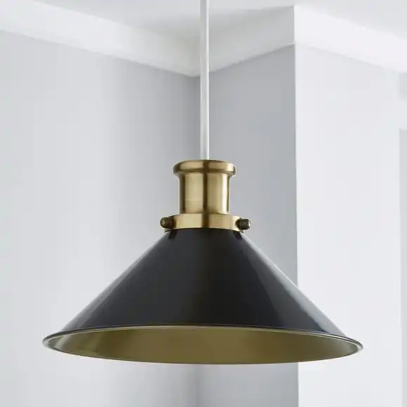 Add this industrial apartment inspired pendant shade to your home to a contemporary touch. The Logan Easy Fit Pendant features a dark nickel painted finish with a lovely antique brass detail.