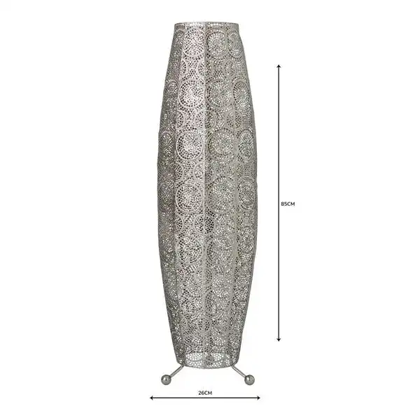 This unique Moroccan inspired floor lamp features a detailed cut out design with a rich Chrome finish, place this lamp in your living space for a beautiful traditional element that instantly enhances your home décor.