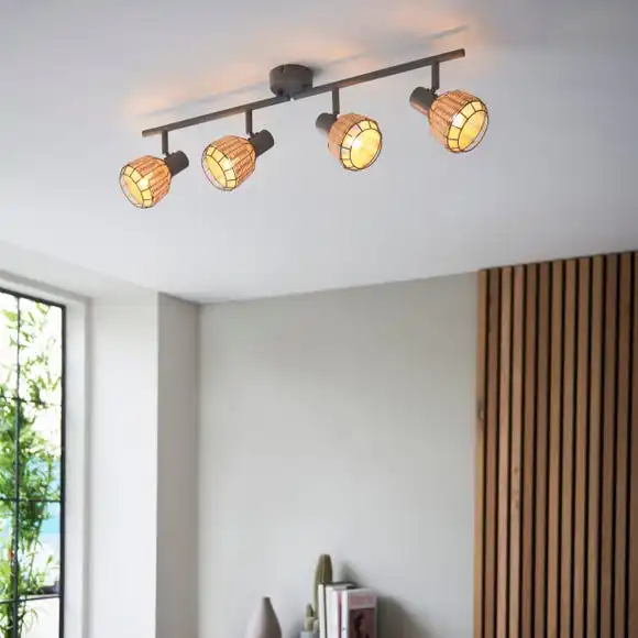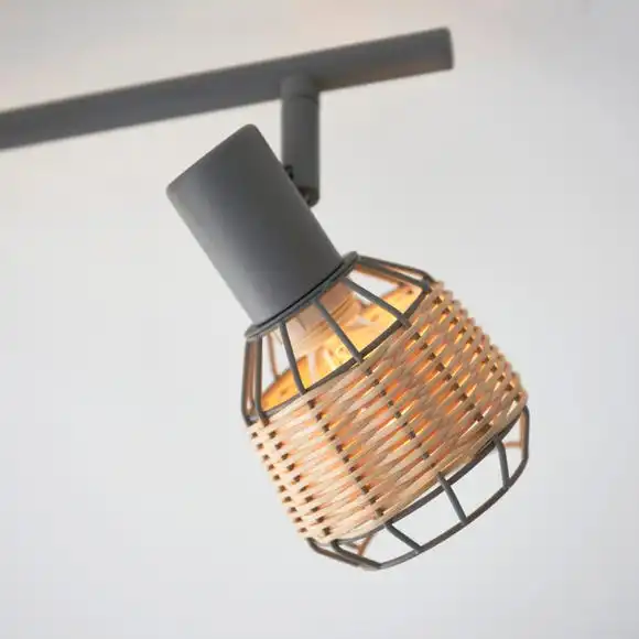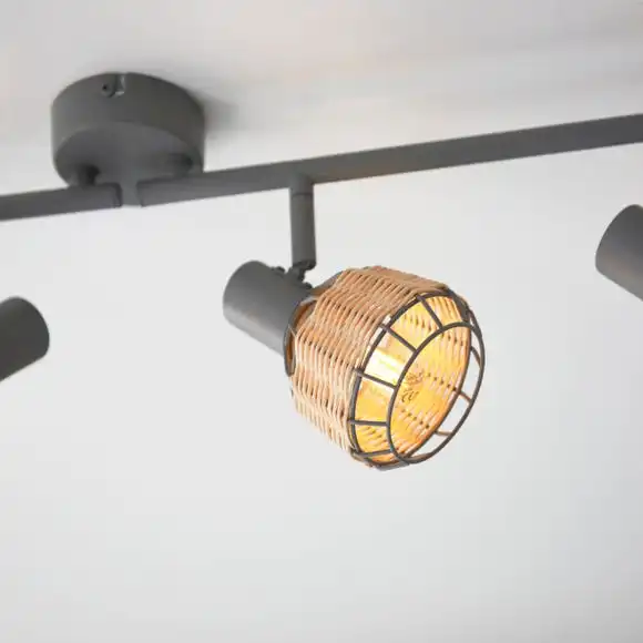 Add a natural touch to your home with this modern Ohio 4 Light Spotlight Bar. Designed with a matt light grey metal base and 4 natural wicker rattan spotlight shades, beautifully woven around the grey metal wire. Complete with a grey split bar that allows further adjustment options. This spotlight will look beautiful in any room and you can even coordinate your home with matching family items. Dimmable compatible with a suitable light switch and bulb.