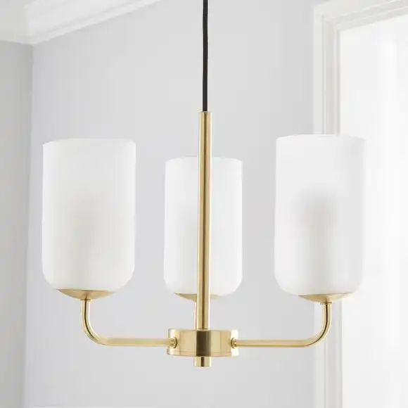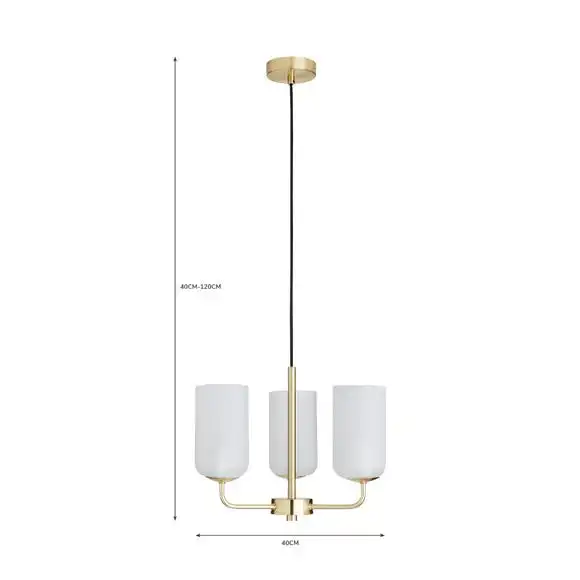 The Palazzo 3 Light Chandelier is perfect for adding a modern, decorative touch to any space. This stunning ceiling fitting features a stunning gold effect finish, chic frosted glass shades, and a complementing black fabric flex with adjustable height. This piece is dimmable compatible, making it both an attractive and practical light fitting.