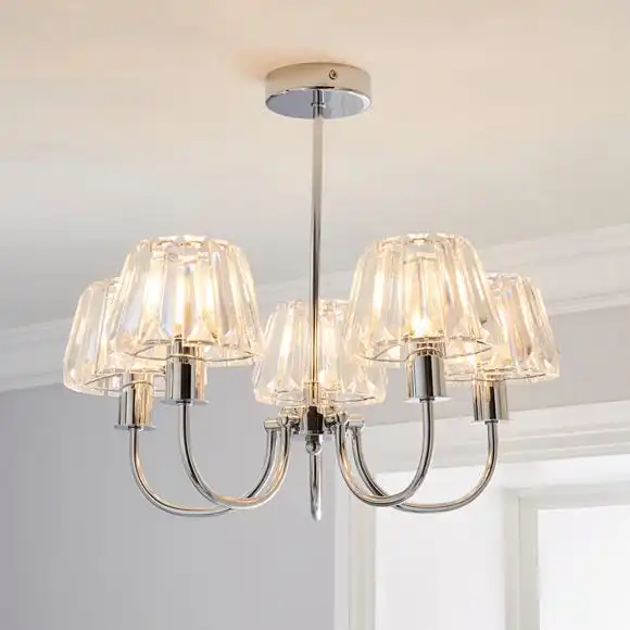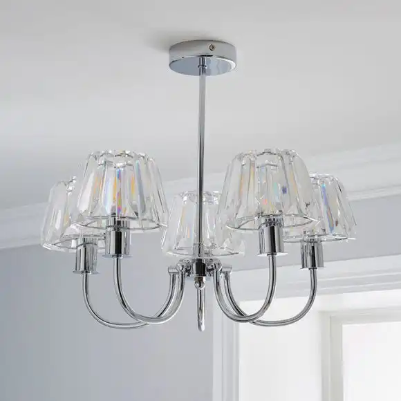 Add glamour to your home with this 5 arm ceiling light. Complete with a chrome finish and modern prism finished shades.
