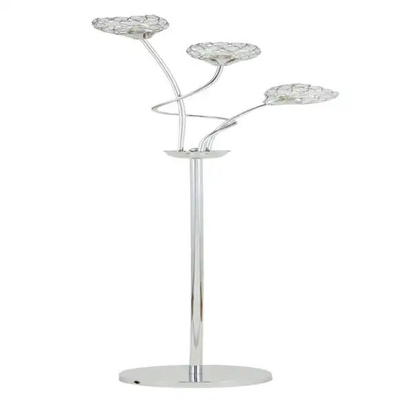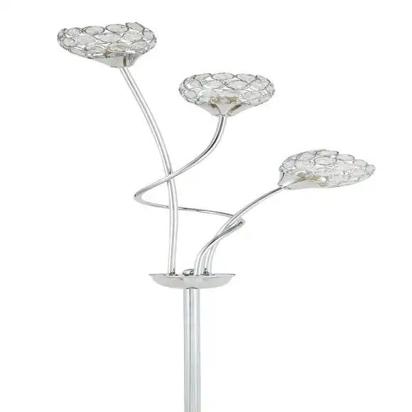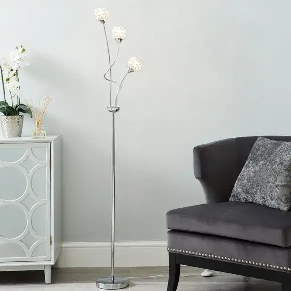 This stunning Portia 3 Light Floor Lamp, with a swirled arm structure, 3 lights and 3 spherical acrylic shades will complement an array of home decors beautifully. The acrylic jewel beads design adds a touch of glamour, along with the chrome finish and a clear cable. The matching wall light, ceiling fitting and table lamp are also available.