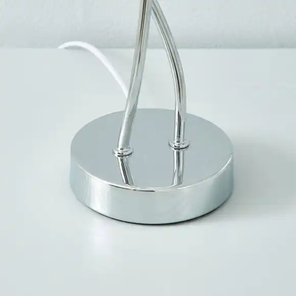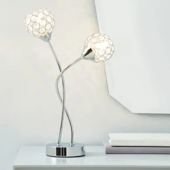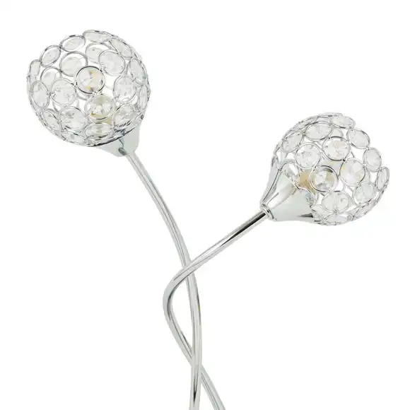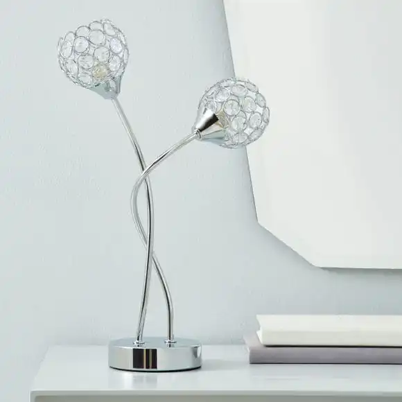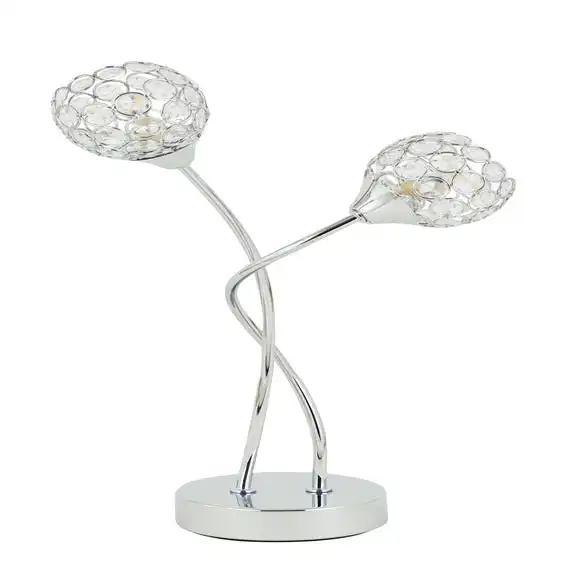 This stunning Portia table lamp, with a swirled arm structure, 2 lights and 2 spherical acrylic shades will complement an array of home decors beautifully. The acrylic jewel beads design adds a touch of glamour, along with the chrome finish. The matching wall light, ceiling fitting and floor lamp are also available.