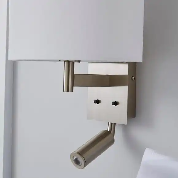The Reader Wall Light in Ivory features a vintage shade and a stunning satin nickel finish. With a push switch included and a steel & fabric construction this is perfect for any home. The small reader light has an integrated LED with 2700 Kelvins and 160 Lumens
