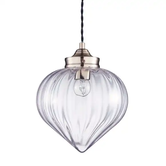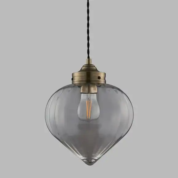 Featuring a shaped glass shade, this dimmable light fitting hangs from a twisted flex and is finished with an antique brass effect plate.