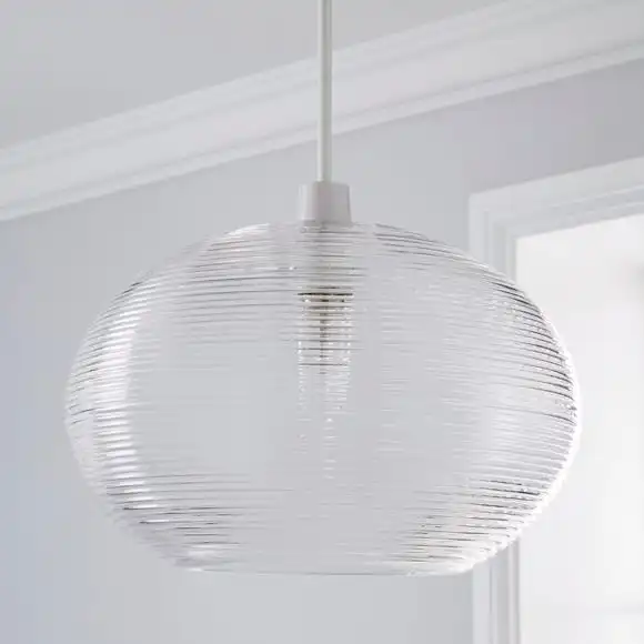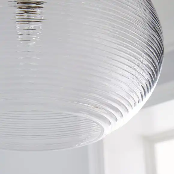 Our Sabrina pendant is made from textured rib transparent glass, which gives it a modern look with an oval shape.