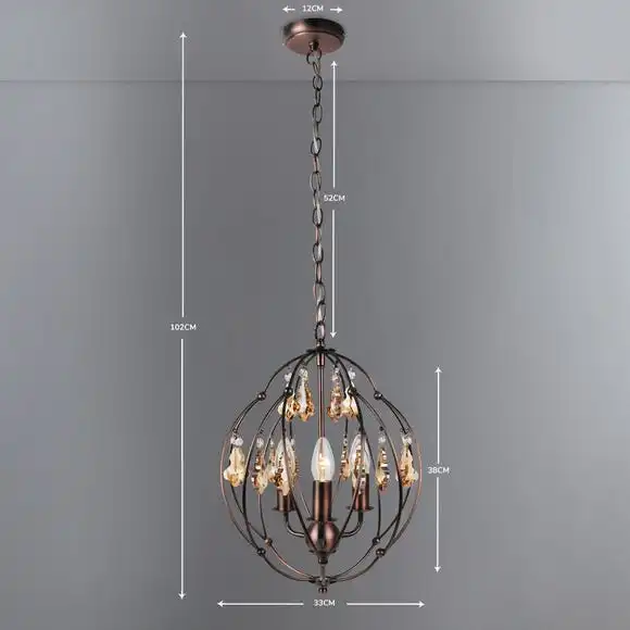 This trend inspired chandelier would be the perfect feature piece to any room. It features an antique copper metal globe with amber glass bead jewels. The fitting has a chain hung detail with a rose tint finish.