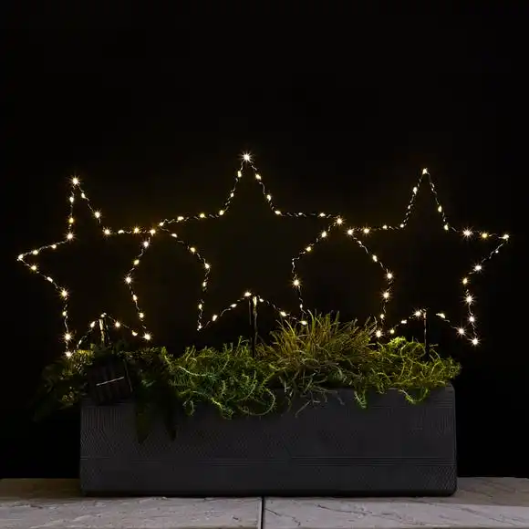 This set of 3 stake lights are perfect for brightening up your garden. With a total of 90 warm white LED copper lights, these star stake lights look beautiful in any garden. This light set features automatic on/off technology (6 hours on and 18 hours off).