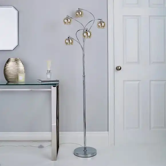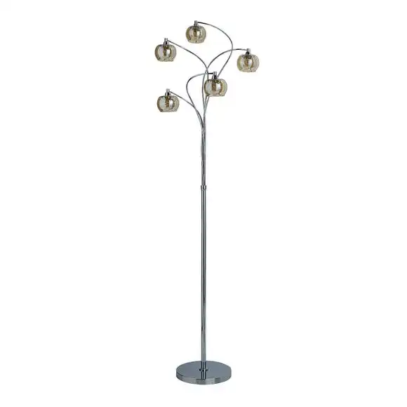 Featuring a sleek chrome finish, this elegant champagne glass five light floor lamp is designed with rounded glass baubles with decorative clear glass droplets.