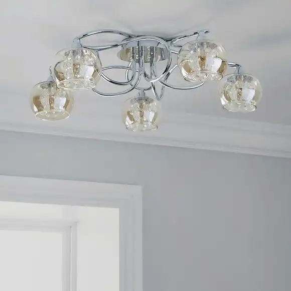 Featuring five tinted champagne bauble shades designed with delicate clear glass droplets, this ceiling fitting is made with a beautiful woven arm frame with a sleek chrome effect finish.
