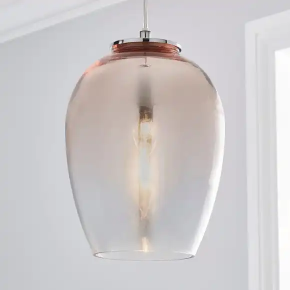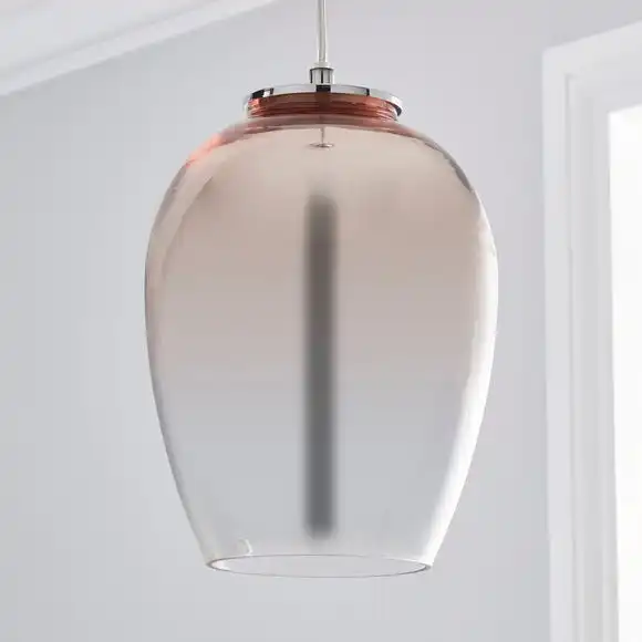 Featuring an ombre finished blush pink glass shade the Seychelles Pendant Fitting would make a glamorous addition to any room. This stunning light is designed with a sleek chrome finished detailing, and a clear cable suspension.