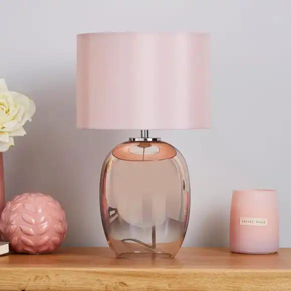 Crafted with a blush pink ombre finished glass base, the Seychelles Table Lamp would make a glamorous addition to any home. This stylish lamp is finished with a gorgeous faux silk shade and sleek chrome detailing.