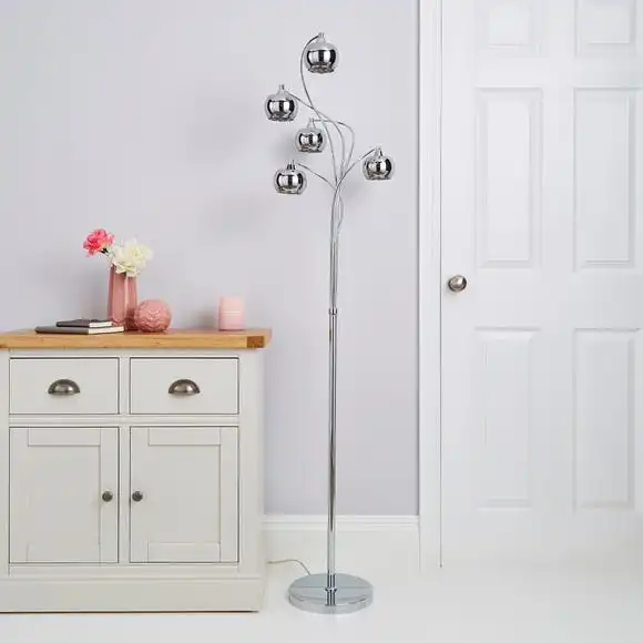 Featuring a sleek chrome finish the elegant Seychelles 5 light floor lamp is designed with rounded glass baubles with decorative clear glass droplets.