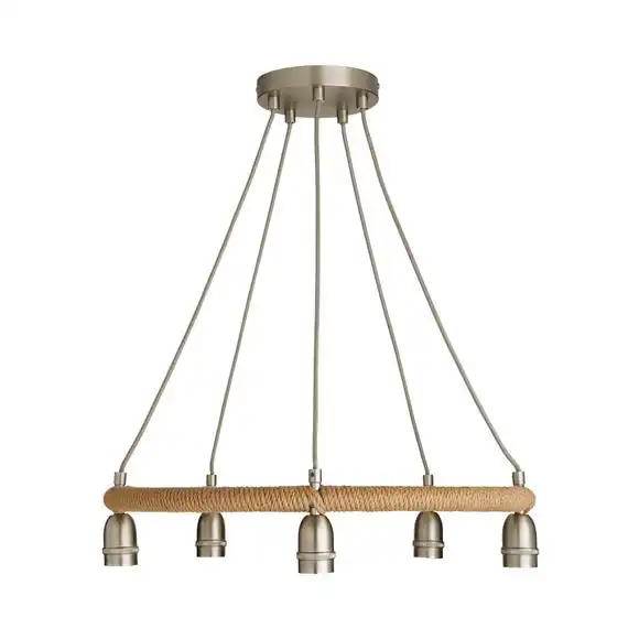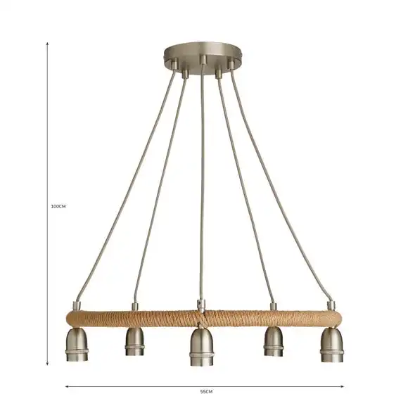 The Shelley Rope 5 Light Ceiling Fitting would make a timeless addition to any home. Crafted with six lamps suspended from height adjustable fabric ropes, complete with a hoop wrapped in rope. The piece is finished with a beautiful satin nickel plated base. With its natural colourway, this ceiling fitting would complement a range of home styles, it can also be paired with matching family items from the Shelley Rope range.