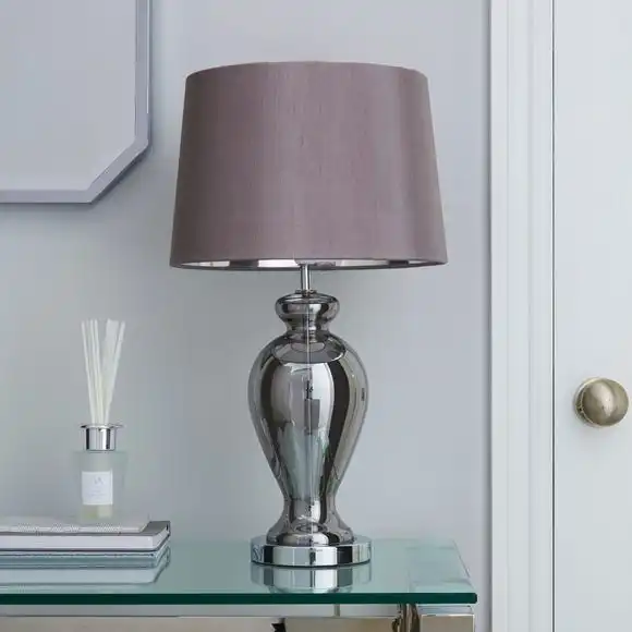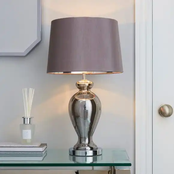 Featuring an urn shaped base, this chrome glass table lamp is finished with a grey faux silk shade and silver lining.