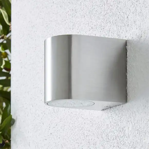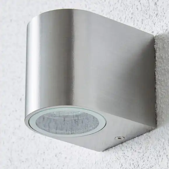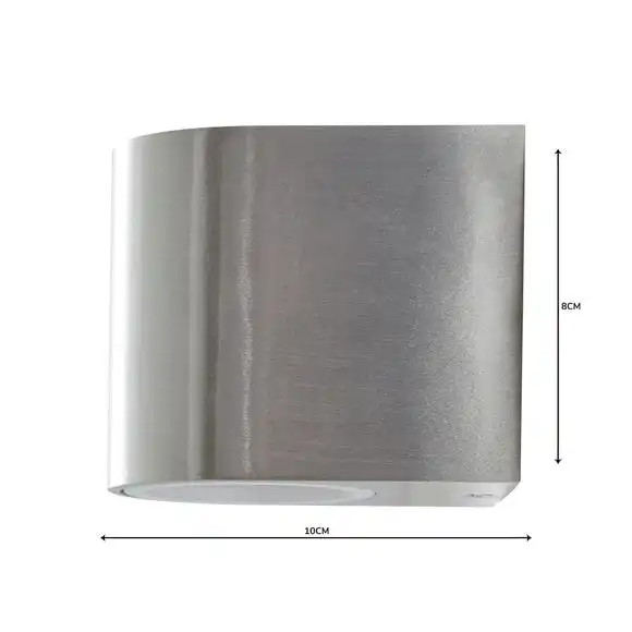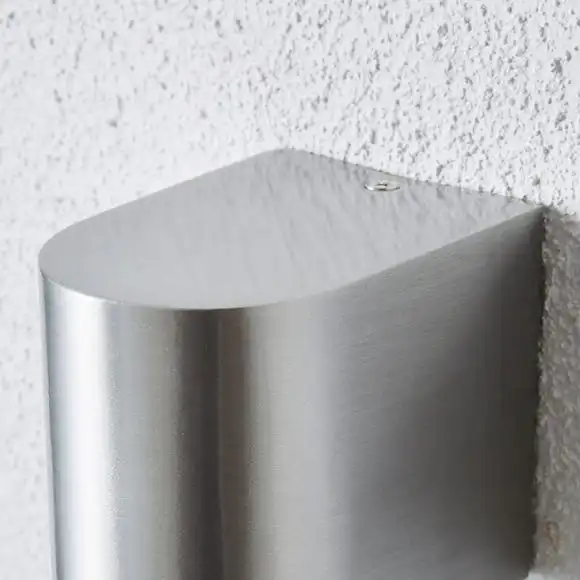 The Tam Outdoor Dimmable Down Lighter, features a simple wall structure and brushed aluminium finish.