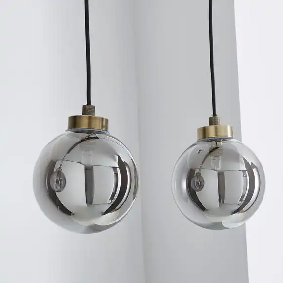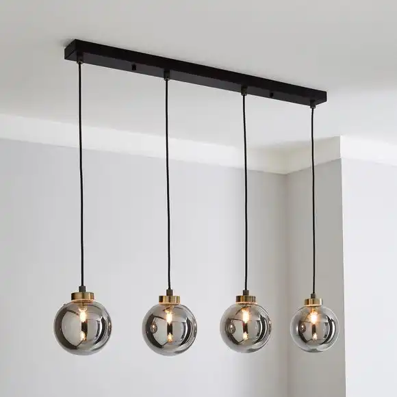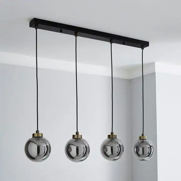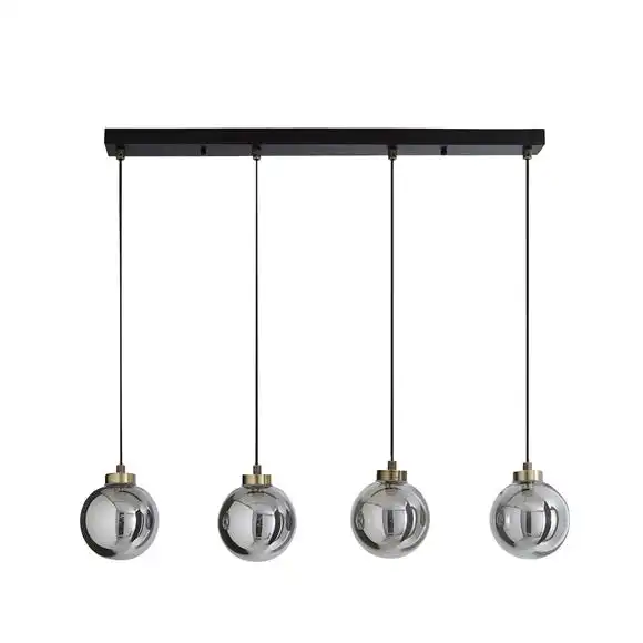 The Tanner 4 light hanging bar fitting is an ideal way to bring a contemporary touch to any dining space. This elegant piece is crafted with mirrored effect smoked glass balls to create a stunning effect, coupled with antique brass effect detailing. This fitting comes complete with a black bar ceiling plate, with complementing black flex cable suspension with adjustable height.